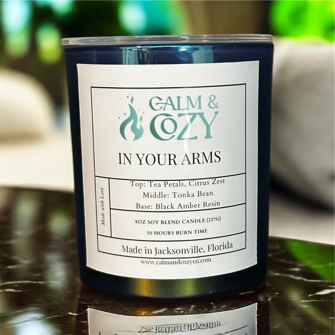 Experience the warmth of a tender embrace with "In Your Arms," a hand-poured soy blend candle crafted in Florida.
